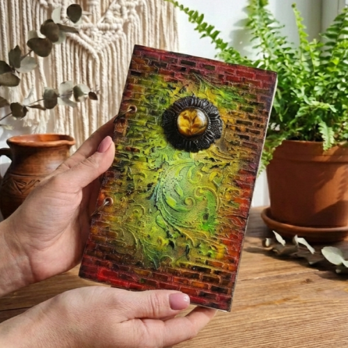 A hardcover ring‑bound notebook, size 20 × 12 cm. The mixed‑media covers are decorated on both sides. Texture paste, alcohol inks, and stamps have been used in the making. The front cover features a glazed medallion with a floral motif.