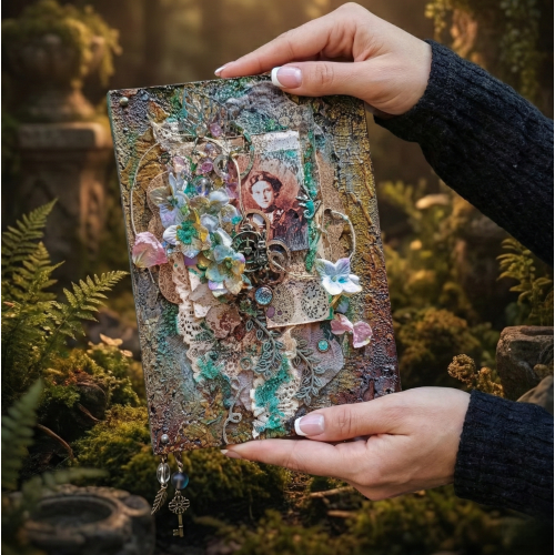 Hardcover vintage A5 notebook “Fairy Tale.” The mixed‑media covers are decorated on both sides, featuring abundant textures, crackle varnish, and layers of color. The front cover displays a portrait of an mystical lady and a clock face pendant with a rabbit (a hint to the Alice in Wonderland).