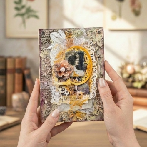 Hardcover vintage A5 notebook “Memory.” The mixed‑media covers are decorated on both sides, featuring abundant textures, crackle varnish, and layers of color. The front cover displays a portrait of an elegant lady.