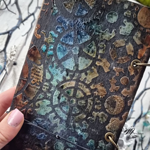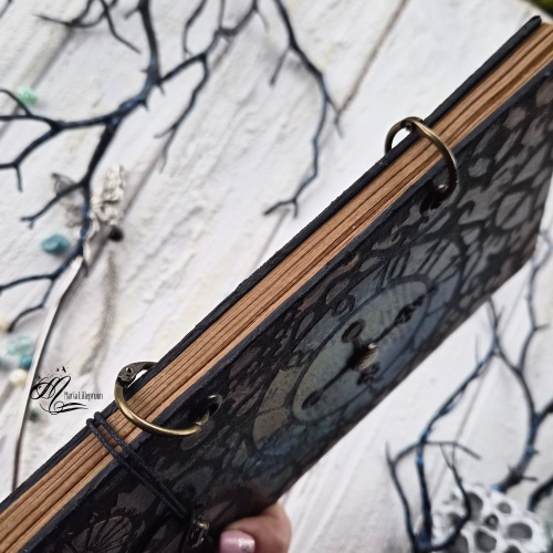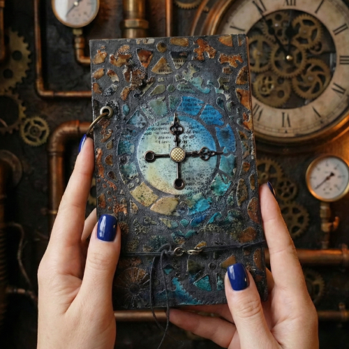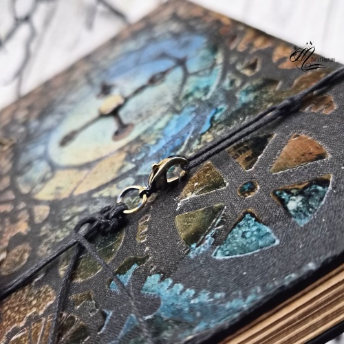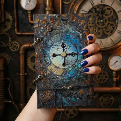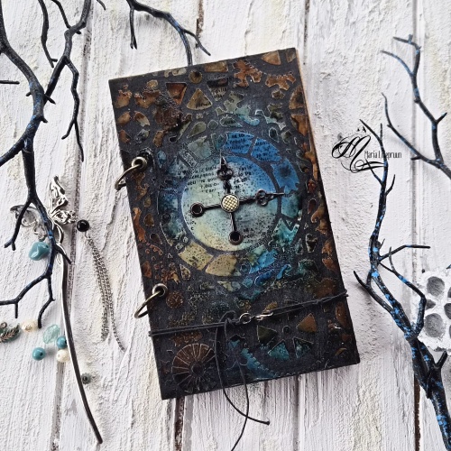 A hardcover ring‑bound notebook, size 20 × 12 cm. The mixed‑media covers are decorated on both sides. The creation process includes texture paste, alcohol inks, and stamps. The front cover features metal clock hands attached with a rivet. A small cord closure with a clasp is also included.