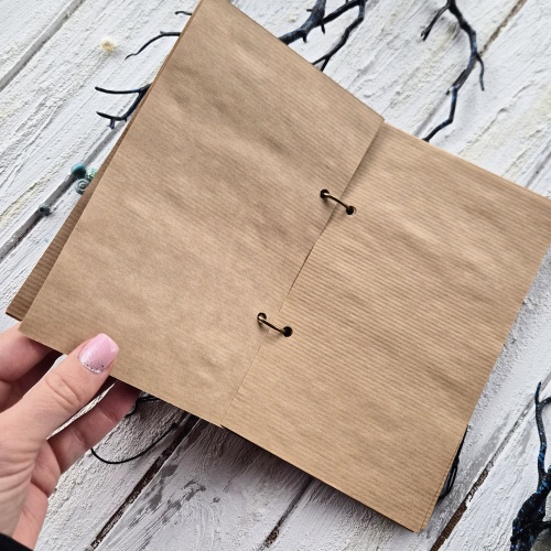 Inside are 50 sheets of dense brown kraft paper. If needed, the old pages can easily be replaced with new ones thanks to the ring binding. The inside of the covers is painted black.