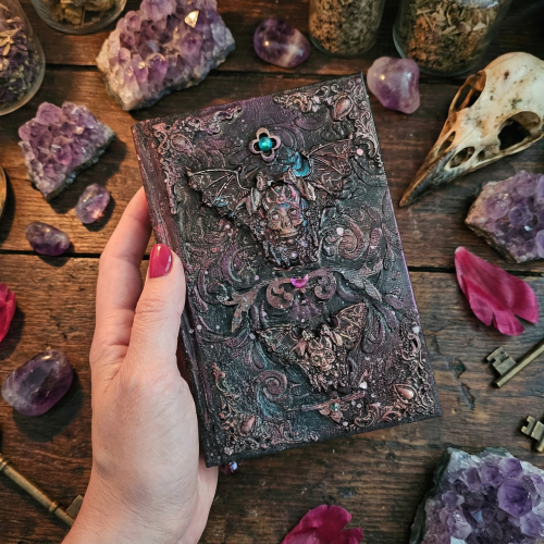 Thick A6 sized notebook "Dark Glamour" with hard mixed media cover. The cover is decorated with texture paste, acrylic paints, wax etc. Main decorative element is a pair of skull bats made of acrylic resin. All the decorations are very well fixed to the cover.