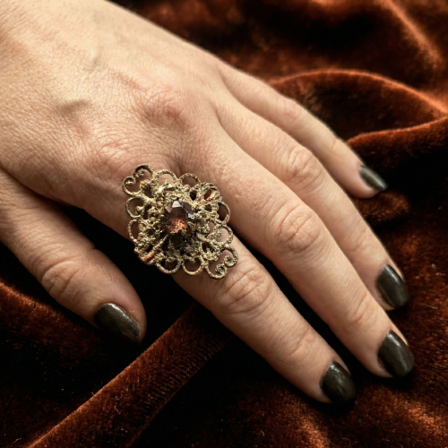 The ring is made of copper. Its diameter is 18 mm, but it suits a lityle bigger fingers too, because the ring is adjustable.