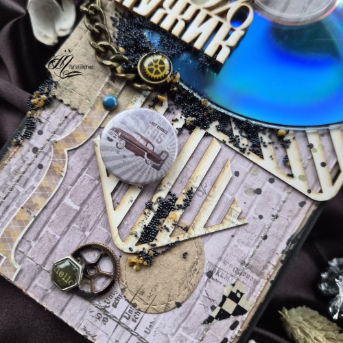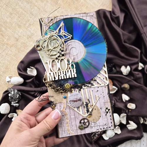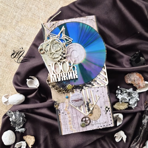 Masculine 21x10 cm card decorated with design paper, CD disk and chipboard.