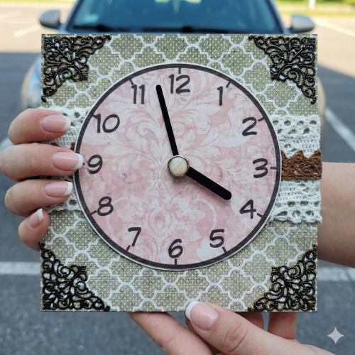 The parking clock is made of strong 3 mm cardboard, decorated with patterned paper. The clock hands are metal. Very practical and durable, nothing will happen to it on your windshield wether its heat or freezing cold.