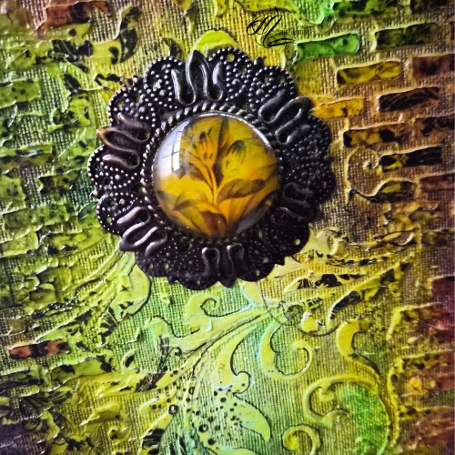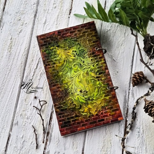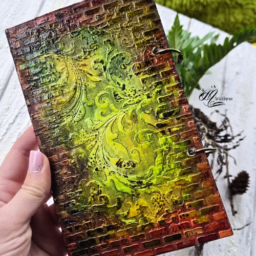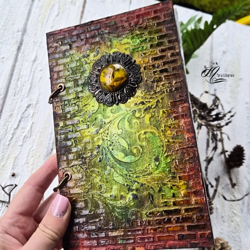 Kõvakaaneline märkmik rõngasköites, suurus 20x12 cm. Segatehnikas kaaned on mõlemalt küljelt kaunistatud. Valmistamisel on kasutatud tekstuurpastat, alkohoolseid tinte, templeid. Esikaanel on lillekujutisega klaasitud medaljon.