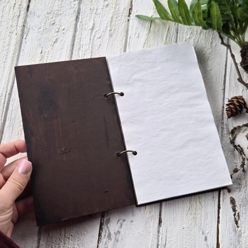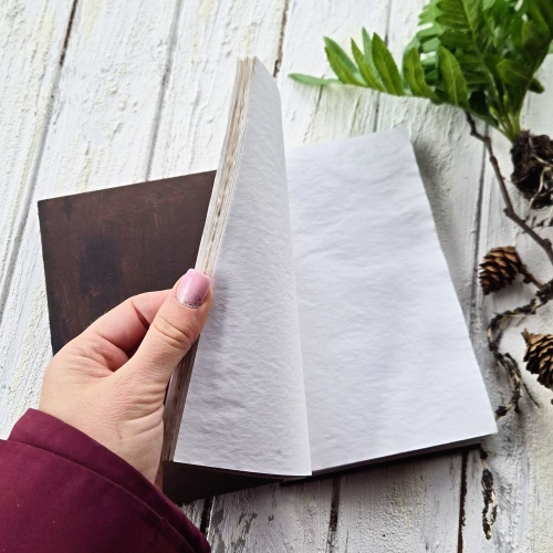 Sees on 50 käsitsi toonitud piimjas-valget lehte (80g/m). Vajadusel saab tuvikus vanad lehed kergesti uutega asendada. Kaaned on seestpoolt pruuniks värvitud.