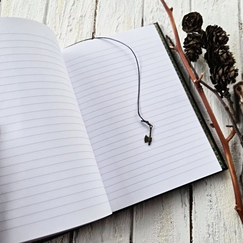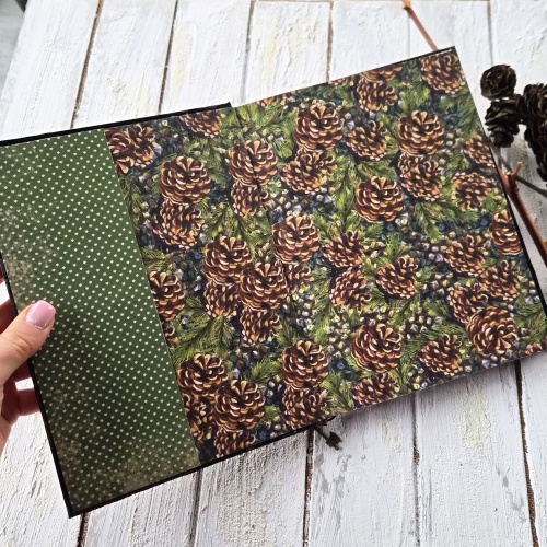 Sees on ca 100 valget joonelist lehte. Sisekaaned on käbimustriga disainpaberist.