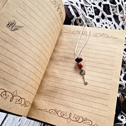 Järjehoidjat kaunistavad pärlid ja väike võtmeke. Märkmikut saab paeltega kinni siduda.