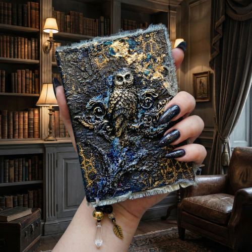 Peakaunistuseks on müstiline öökull akrüülvaigust. Dekoor on korralikult kinnitatud. Kaantel on kasutatud tekstuurpastat, akrüülvärve, vaha, kuldpotaali, krakleelakki, embossing pulbrit jm. Kaaned on kaetud kaitselakiga.
