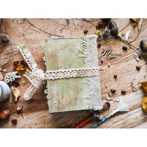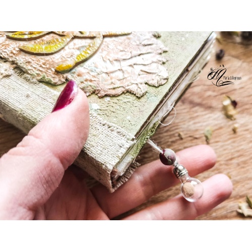 Märkmikul on tugevast klaasist ripatsiga kaunistatud järjehoidja ja pitspaelad, mida saab kokku siduda.