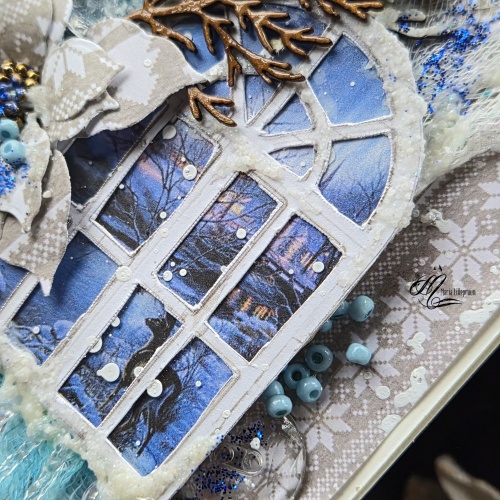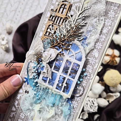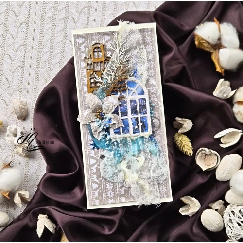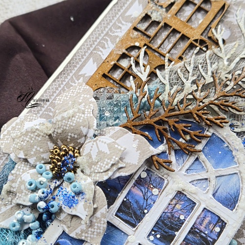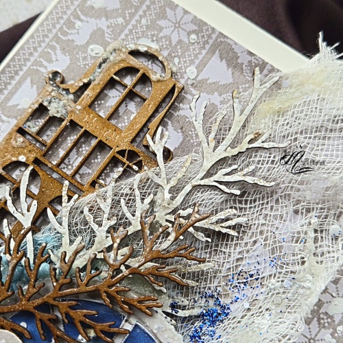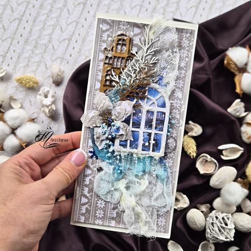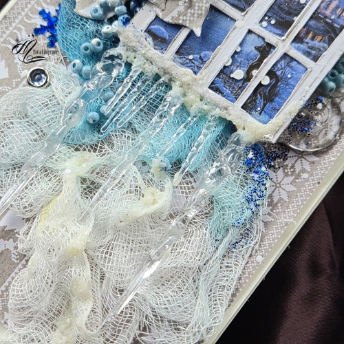 Kaunistuseks disainpaber, käsitöölill, segatehnikas dekoreeritud väljalõiked, peaaegu ehtsad jääpurikad :). Kaardi tagakülg on samuti kaetud disainpaberiga.
