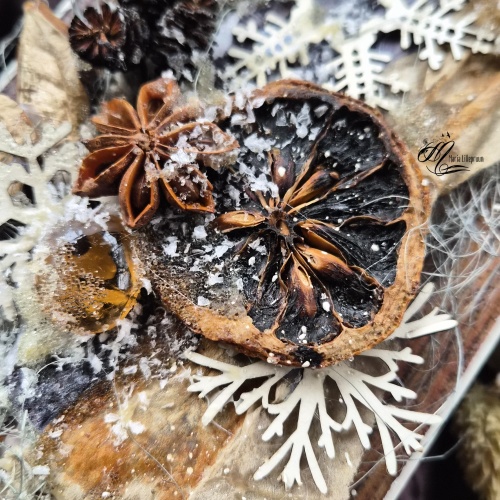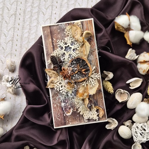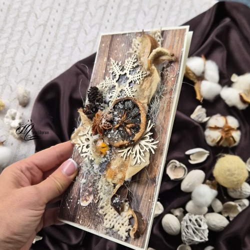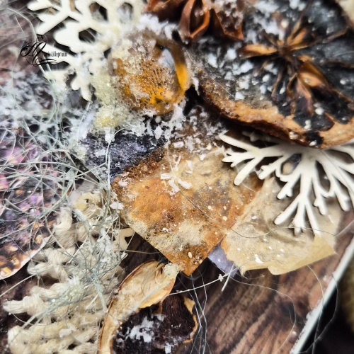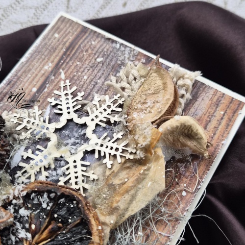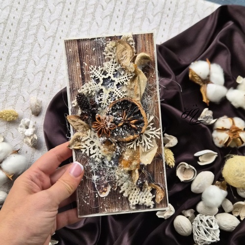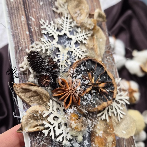 Kaunistuseks kuivatatud looduslikud materjalid ja segatehnikas dekoreeritud väljalõiked.