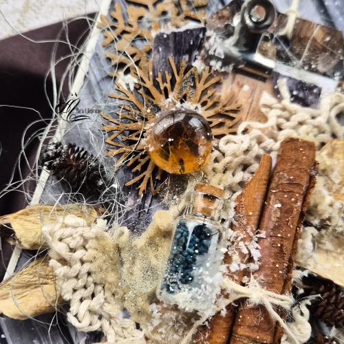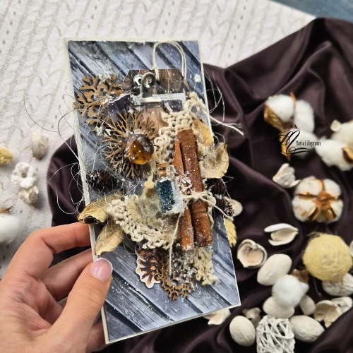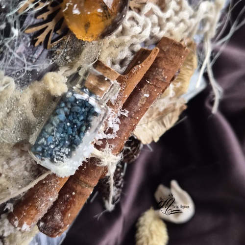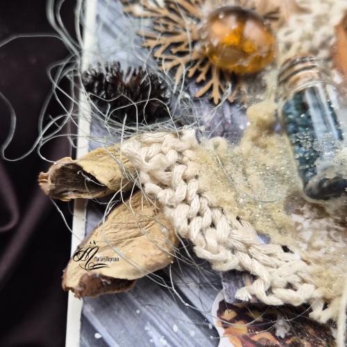 Kaunistuseks kuivatatud looduslikud materjalid ja segatehnikas dekoreeritud väljalõiked.