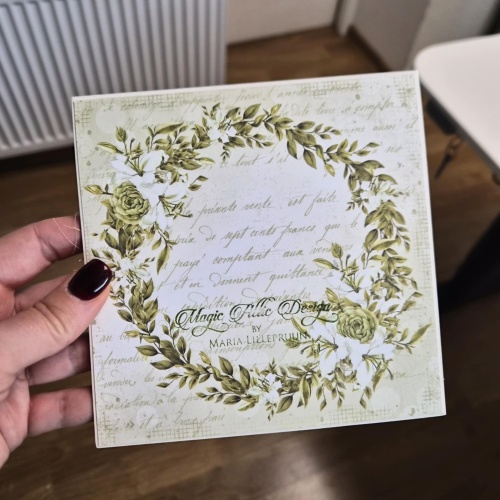 Kevadvärvides ruudukujulinhe (15x15 cm) mixed media (segatehnikas) kaart. Kaunistusnupul on tekst "Life is beautiful". Tagakülg samuti kujundatud.