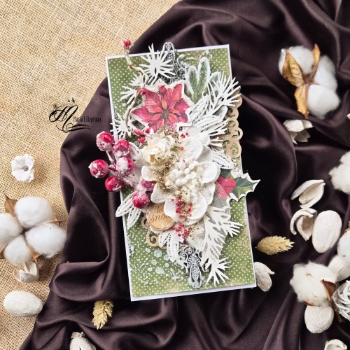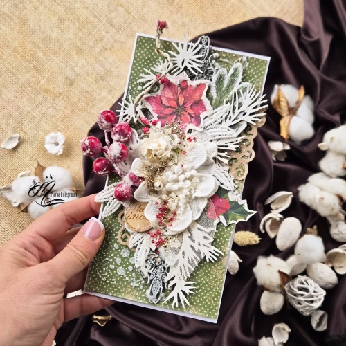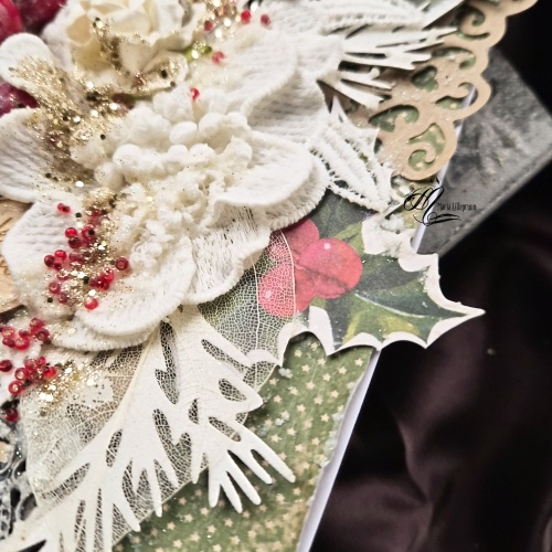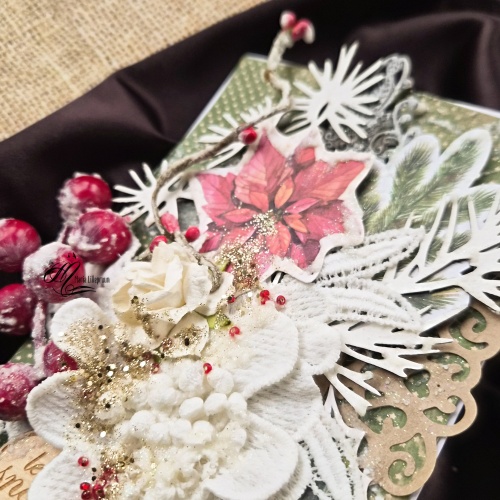 Kaunistuseks disainpaber, pärlid, pits ja segatehnikas dekoreeritud väljalõiked.
