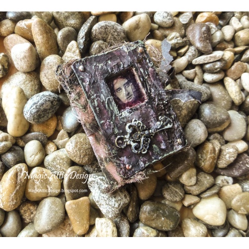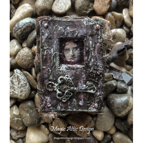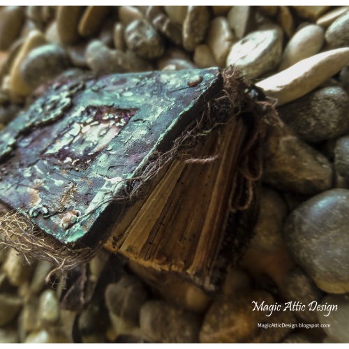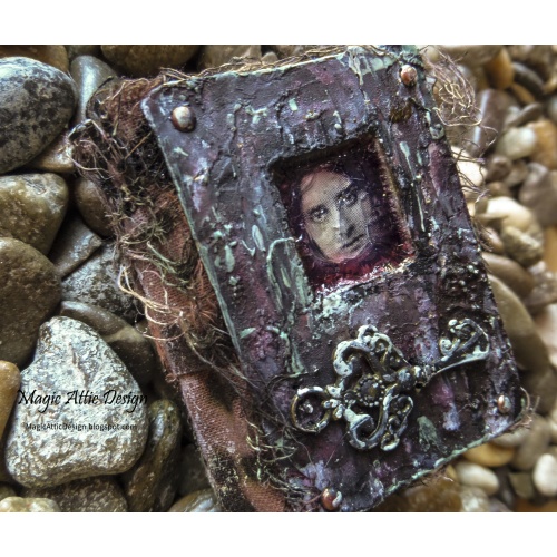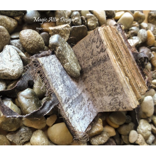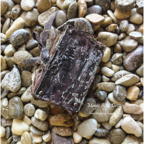 Pisike tume "nõiaraamat (suurus 6 x 4,5 cm) segatehnikas kaantega. Köidetud kohviga toonitud paberist ja kergelt lõhnastatud patšuli õliga. Sees on ca 50 lehte, millel on erinevad plekid, pritsmed jm vanandavad efektid, kuid nad on piisavalt heledad ja saab kirjutada.